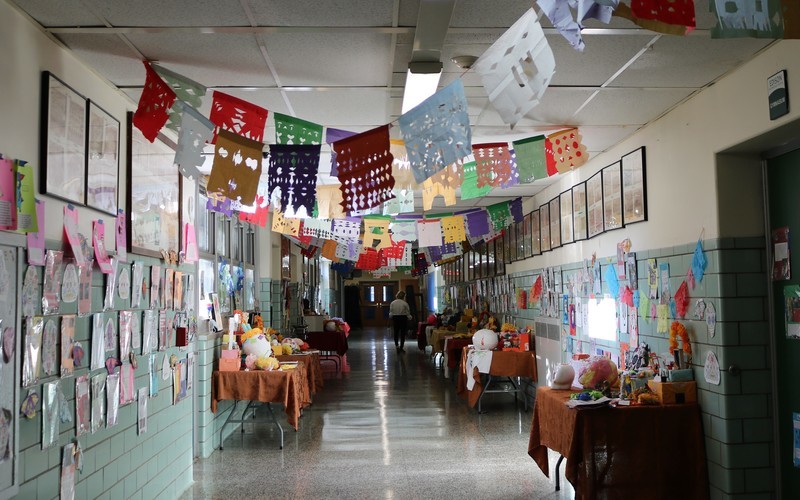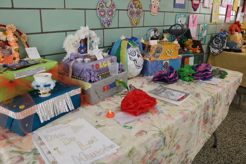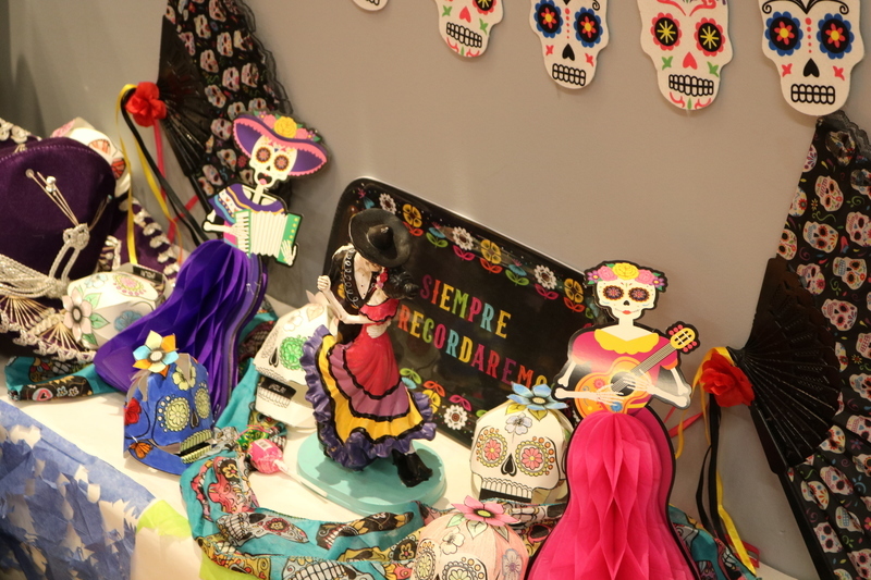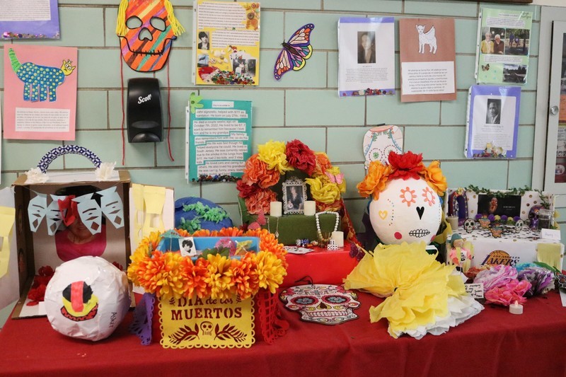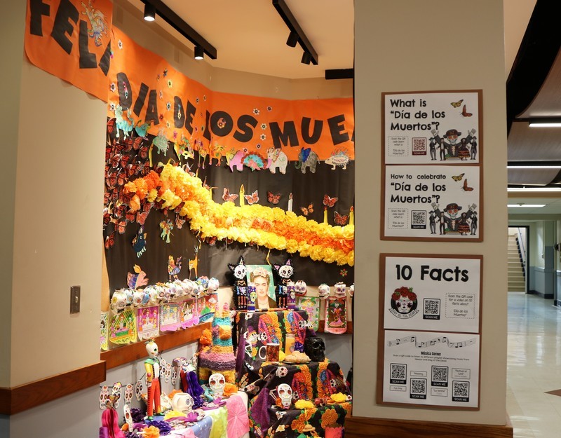 The Day of the Dead, which largely originated in Mexico but is celebrated throughout Latin America and elsewhere, honors deceased loved ones with festivals and lively celebrations. At Roosevelt, a colorful display adorned a corner near the main entrance.
