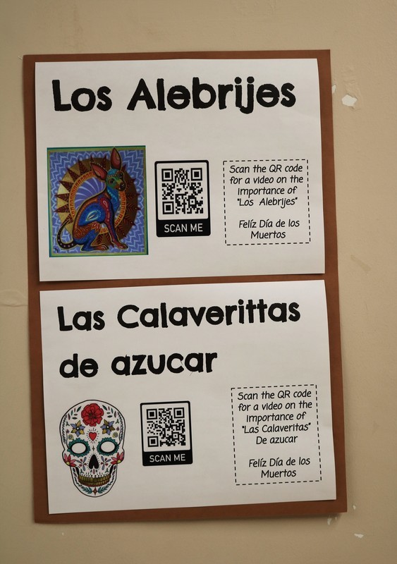 “At first glance, you notice the beautiful colors of flowers and designs,” says RIS world language teacher Maria Reilly who collaborated with technology and special education teachers, the media specialist, and “creative helper students” to create the display. “Upon further glance, students and staff were able to learn more about this special day that honors our deceased loved ones by using QR codes throughout the display.”
